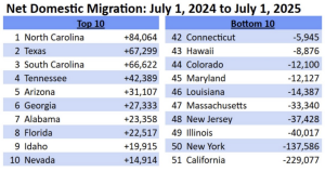 Unleash Prosperity, a pro-growth advocacy group that parsed the data, listed North Carolina, Texas, South Carolina, Tennessee, and Arizona as the states with the largest net domestic migration gains, with California, New York, Illinois, New Jersey, and Massachusetts hemorrhaging people.