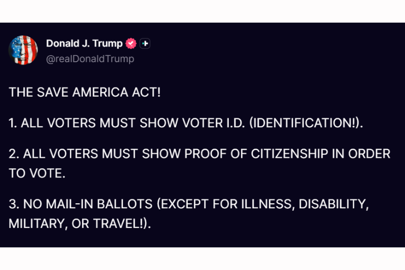 First on Trump’s list was “ALL VOTERS MUST SHOW VOTER I.D.” Secondly, Trump said, “ALL VOTERS MUST SHOW PROOF OF CITIZENSHIP IN ORDER TO VOTE.” He also called for mail-in ballots to be eliminated, except in cases of “illness, disability, travel, or for military personnel.”