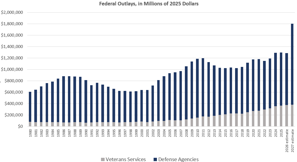 Combined with veterans spending—which is just deferred military spending that is placed in a separate category for political reasons—total military spending would reach to $1.8 trillion if Trump gets his way.