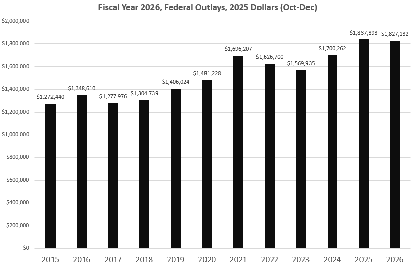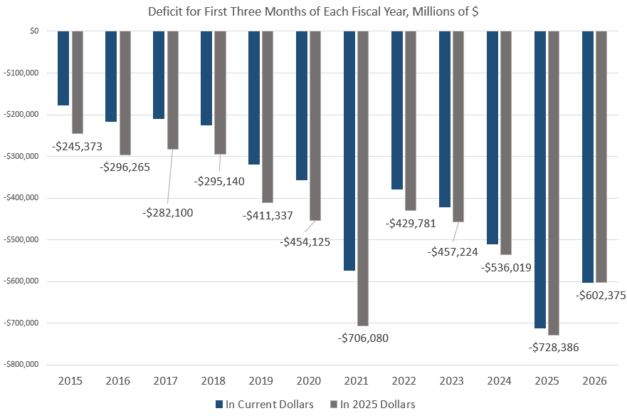 Trump’s pledge to increase military budgets by 50 percent comes as we find that federal spending in the new fiscal year remains at some of the highest spending levels we’ve ever seen. Only three months into the fiscal year (which began on October 1), the federal government has spent more than $1.8 trillion, which is the second highest spending level for the period in history—even when adjusted for inflation. Not surprisingly, the federal government has run up a deficit of $602 billion. That’s the third highest deficit total for the period in history (inflation adjusted), topped only by spending of the Covid Panic and Biden’s final year in office.