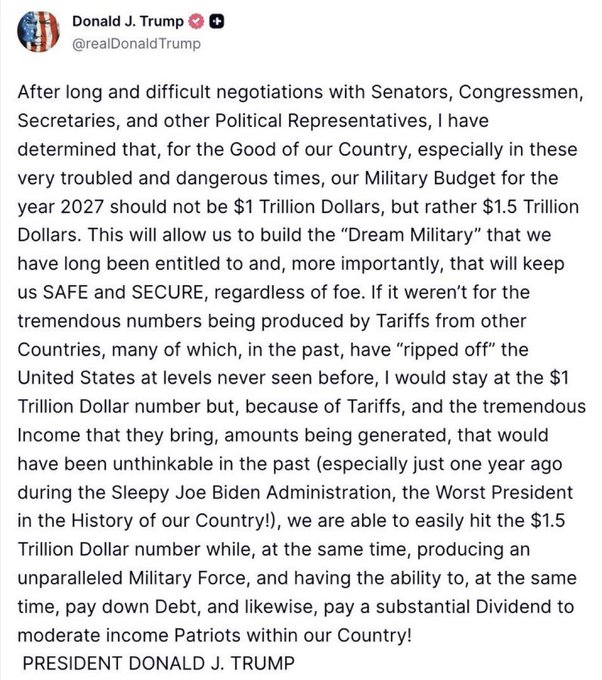 After long and difficult negotiations with Senators, Congressmen, Secretaries, and other Political Representatives, I have determined that, for the Good of our Country, especially in these very troubled and dangerous times, our Military Budget for the year 2027 should not be $1 Trillion Dollars, but rather $1.5 Trillion Dollars … This will allow us to build the ‘Dream Military’ that we have long been entitled to and, more importantly, that will keep us SAFE and SECURE, regardless of foe.
