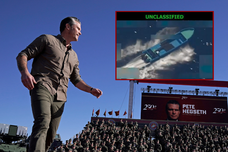 (L) Secretary of War Pete Hegseth walks on stage at the Marine Corps’ 250th anniversary celebration at Camp Pendleton, California, on October 18, 2025. (Photo by Oliver Contreras / AFP) / (R) Department of War conducting a lethal kinetic strike on a vessel being operated by a Designated Terrorist Organization. (Photo via: Pete Hegseth — Department of War)