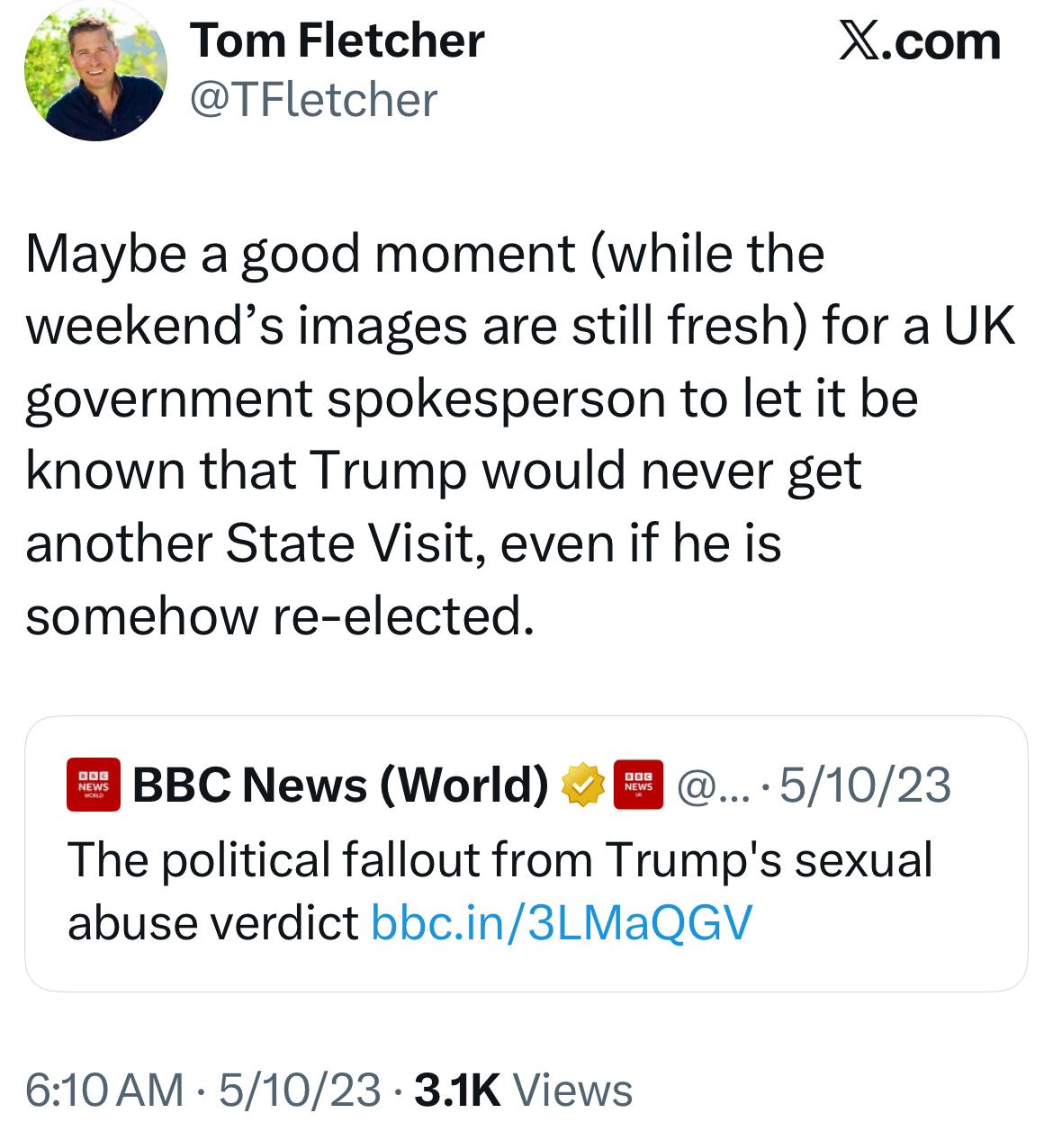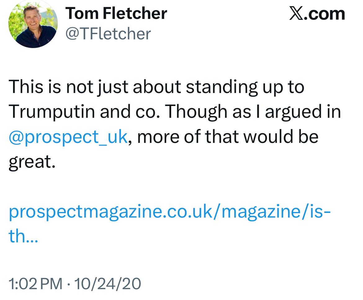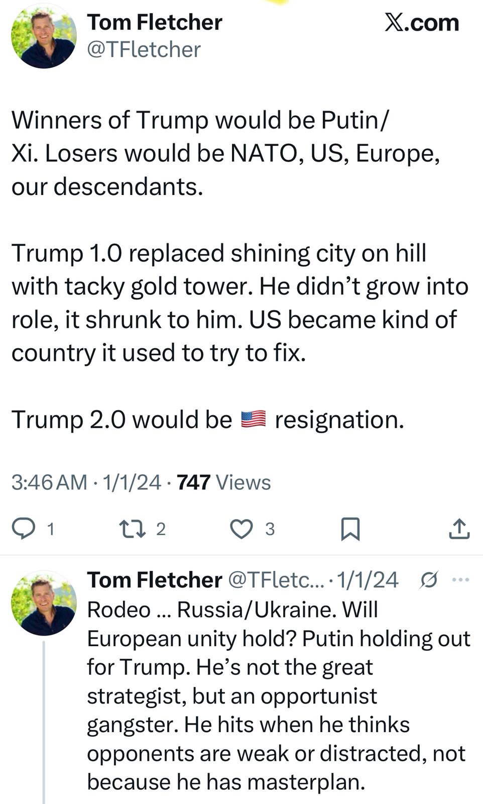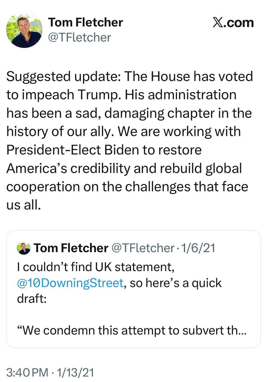 Fletcher has shared his anti-Trump views on social media for years. At the tail end of Trump’s first term, after the House of Representatives voted to impeach him, Fletcher offered a draft of the statement he thought then-U.K. prime minister Boris Johnson should have issued.