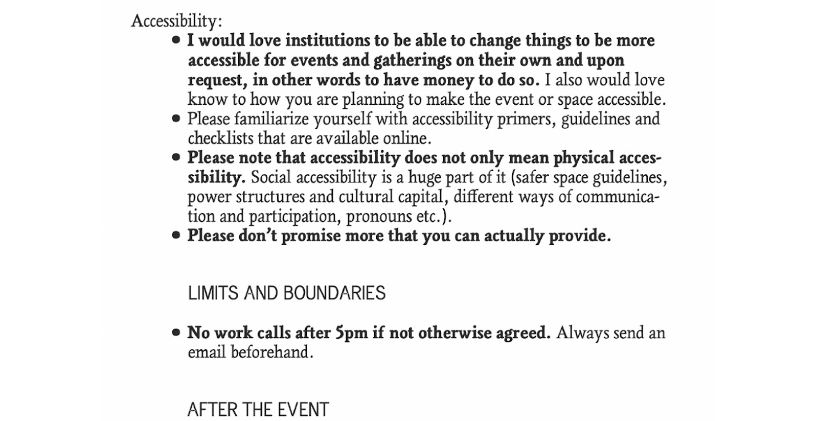 Course instructors and artists Peter Gouge and Flounder Lee required no explanation for the demands made on access riders and instructed students to list them “without explaining further (unless you wish to).”