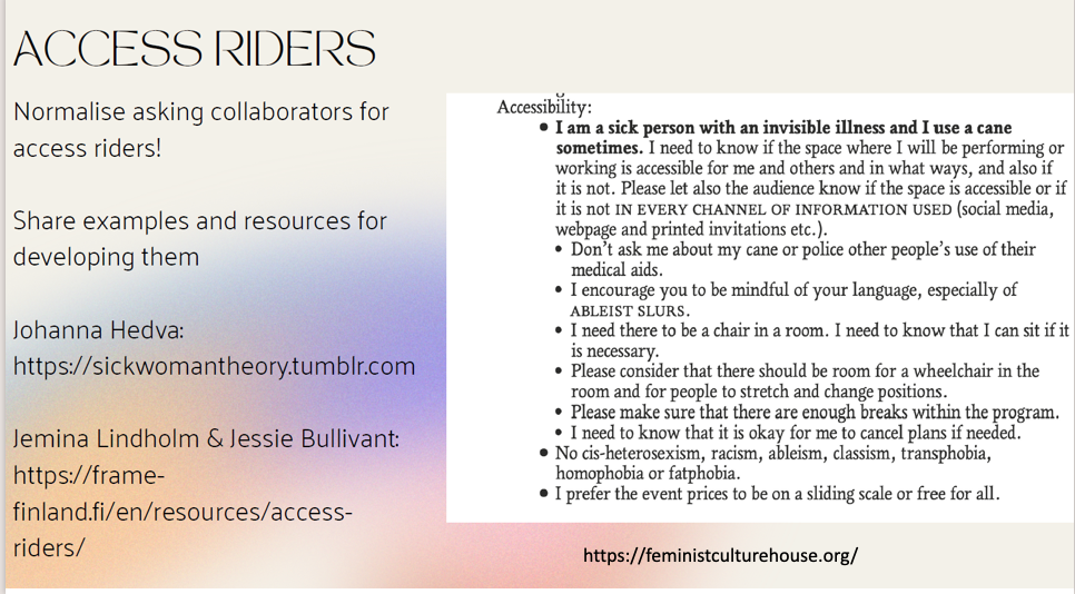 While “access riders” are typically used by disabled students and professional artists to ensure legitimate special needs are met, the professors laid out a broad range of demands students might make of artistic “collaborators.” A PowerPoint presentation curated by WARP professors gave the following examples and told students, quoting the artist Johanna Hedva, that “access documents are used by rock stars and divas all the time—they’re simply called riders and no one bats an eye. This is because they are helpful for everyone involved.” The presentation encouraged students to “normalise asking collaborators for access riders!”