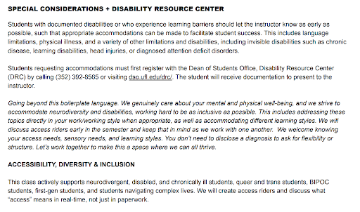 The syllabus included a section on “Accessibility, Diversity & Inclusion” appended to customary language about resources available to students who are sick or disabled. It indicated that “access riders”—statements used to explain hardship or special needs and request accommodations—for “neurodivergent, disabled, and chronically ill students” may also be available to “queer and trans students, BIPOC students, first-gen students, and students navigating complex lives.”