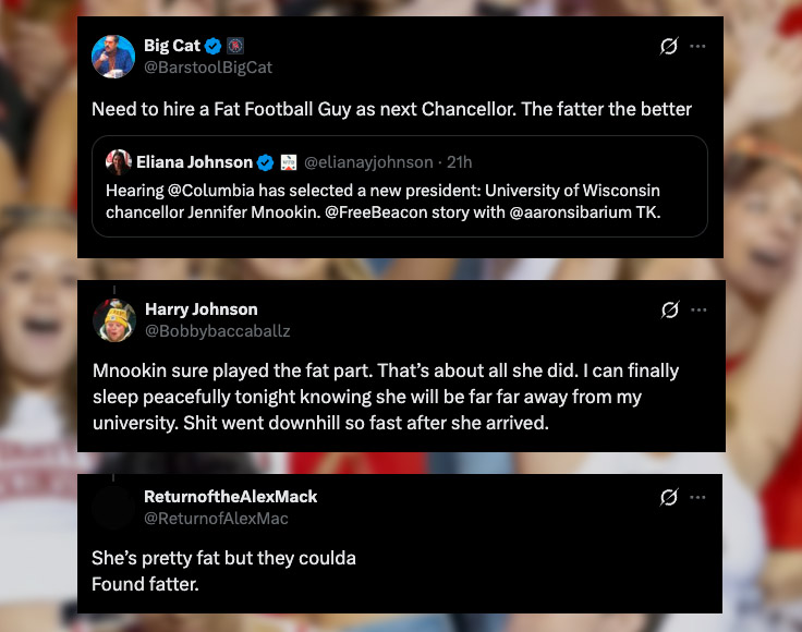 University of Wisconsin fans were delighted to read the Washington Free Beacon‘s scoop about their school’s chancellor, Jennifer Mnookin, leaving her job to become president of Columbia University. Appreciators of college football and other normal American pursuits were particularly excited to learn that Mnookin was taking her “talents” elsewhere, according to a Free Beacon analysis of Wisconsin-themed social media commentary.