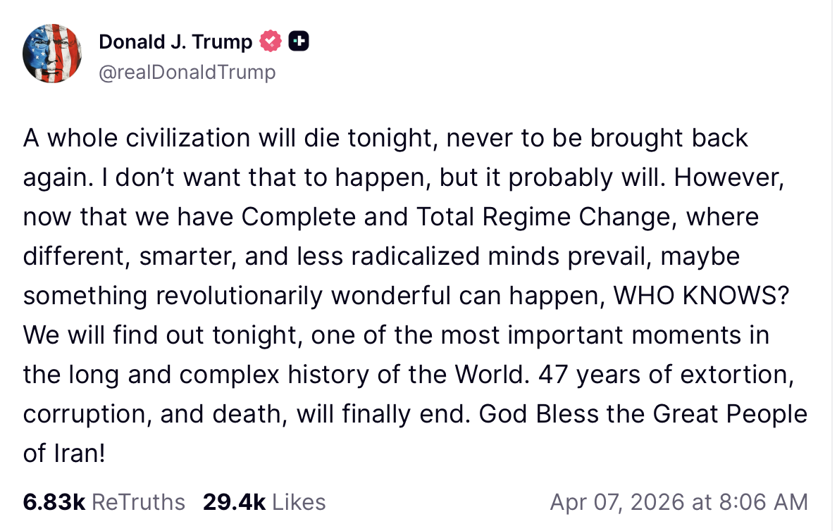 “A whole civilization will die tonight, never to be brought back again,” Trump wrote on Truth Social Tuesday morning. “I don’t want that to happen, but it probably will. However, now that we have Complete and Total Regime Change, where different, smarter, and less radicalized minds prevail, maybe something revolutionarily wonderful can happen, WHO KNOWS? We will find out tonight, one of the most important moments in the long and complex history of the World. 47 years of extortion, corruption, and death, will finally end. God Bless the Great People of Iran!”
