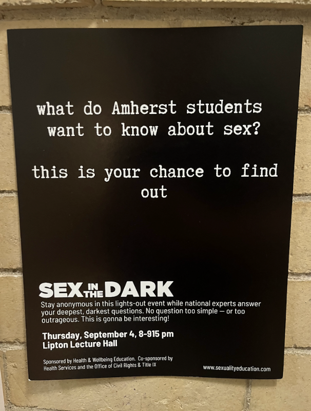 Another official event at Amherst is “Sex in the Dark,” an annual program held at the beginning of each school year. Organized by the Office of Health and Wellbeing Education, the event takes place in darkness. Students report being encouraged to speak about uncomfortable sexual topics, such as their sexual orientation, habits, kinks, and fantasies with the “sex experts” in the dark room.
