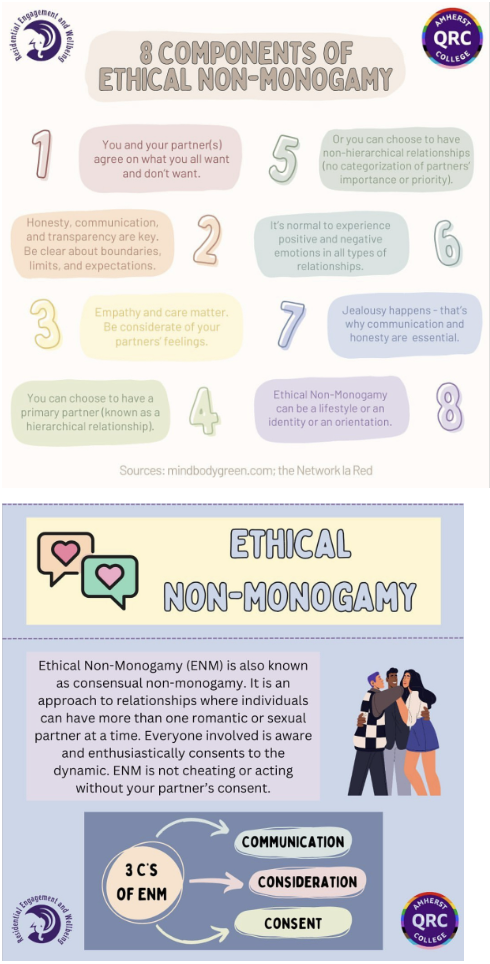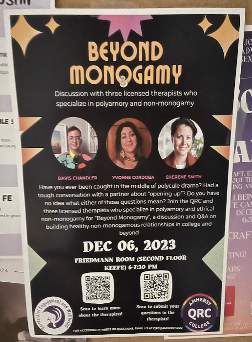 Materials promoted by the Queer Resource Center aimed to teach students different types of healthy non-monogamous relationships, listing sexual scenarios such as “open relationships,” “threesomes,” and “swinging,” as well as newer sex concepts like “relationship anarchy,” and “polyfidelity.” The Amherst communication office categorized “Beyond Monogamy” as part of its sexual health education programming.