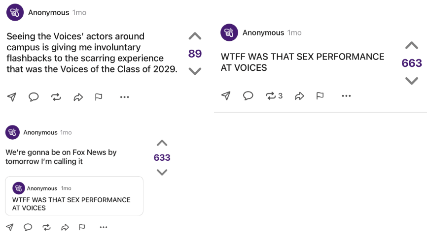 “WTFF WAS THAT SEX PERFORMANCE AT VOICES,” one user posted. “Seeing the Voices’ actors around campus is giving me involuntary flashbacks to the scarring experience that was the Voices of the Class of 2029,” another said.