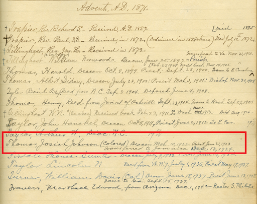 “We have added by ordination to the Diaconate the Rev. J.J. Thomas (colored), who came to us from the Presbyterian Church, North, and who is now at work at the Church of the Redeemer, Pineville,” the Council of the Episcopal Diocese of South Carolina reported in May 1922.