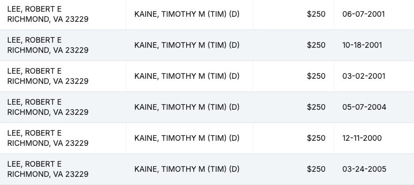 Robert E. Lee: Sen. Tim Kaine (D., Va.) has taken money from the former Confederate general.
