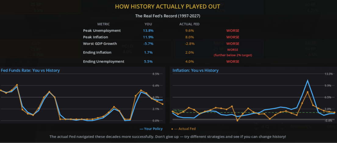 I did a few other experiments in other time periods. I tried to see what would happen if I copied actual Fed policy from the 1990s to the 2020s. I pulled up data from FRED on the FFR, the discount rate, and OMOs and plugged them into the game each quarter. Surprisingly, I did worse than the “actual Fed” from the game’s perspective even though I did what the actual Fed did!