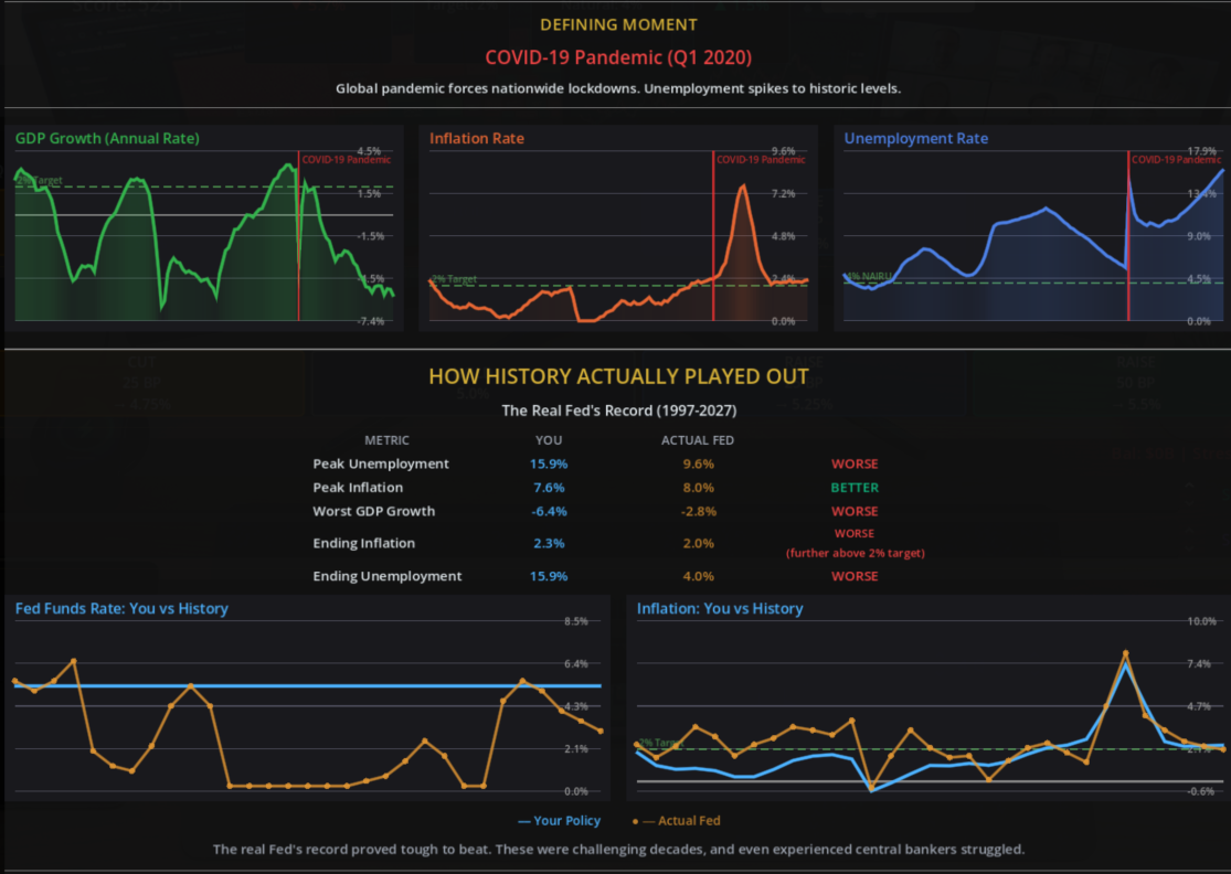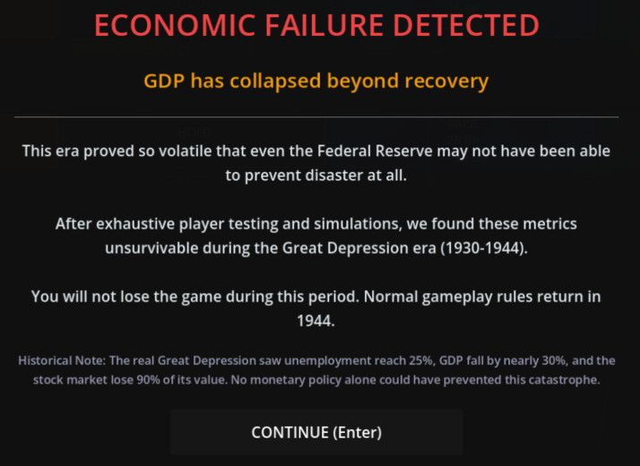 An unfortunate consequence of this is that the game is designed in such a way that certain economic events are bound to happen, no matter what choices you make as Fed chair in the years preceding them. No matter what a player does, for example, there will be a stock market crash in 1929 and a subsequent collapse in GDP and spike in unemployment. The game acknowledges this:
