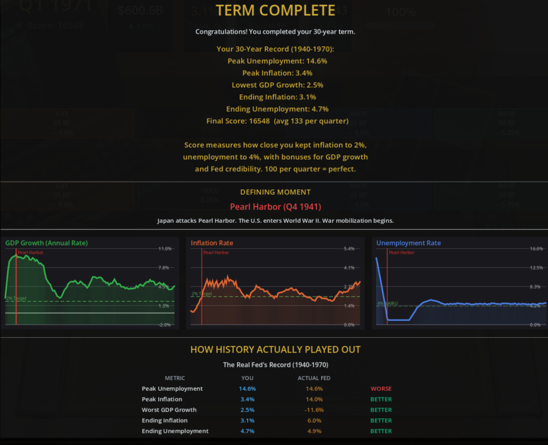 So, how do you beat the Fed? On my first playthrough, I chose the 1940-1970 time period and just sort of used my gut on interest rate changes, based on whether inflation or unemployment was further from target. I adopted the mainstream view of how to tinker with interest rates to nudge the economy in the “right” direction. This worked out well for me: