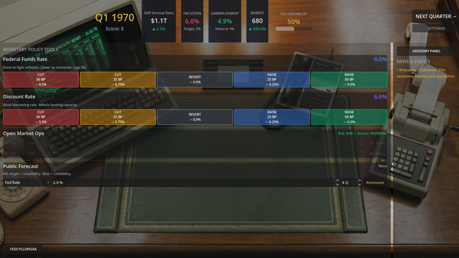 Gameplay is very simple. It’s turn-based and you only have a few policy levers to adjust. You are given a few data points on GDP, inflation, unemployment, the stock market, “Fed Credibility,” and the level of stress in the banking system. You also have a news panel with headlines. Each quarter, you make a decision on the federal funds rate, the discount rate, and open market operations. You can also make announcements about future outcomes—correct announcements help the Fed’s credibility while incorrect ones damage the Fed’s credibility. After making your choices, you advance to the next quarter and start again with fresh data.