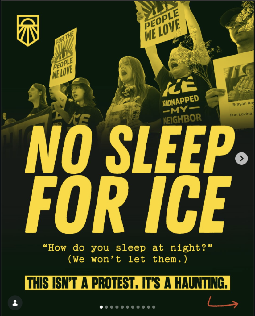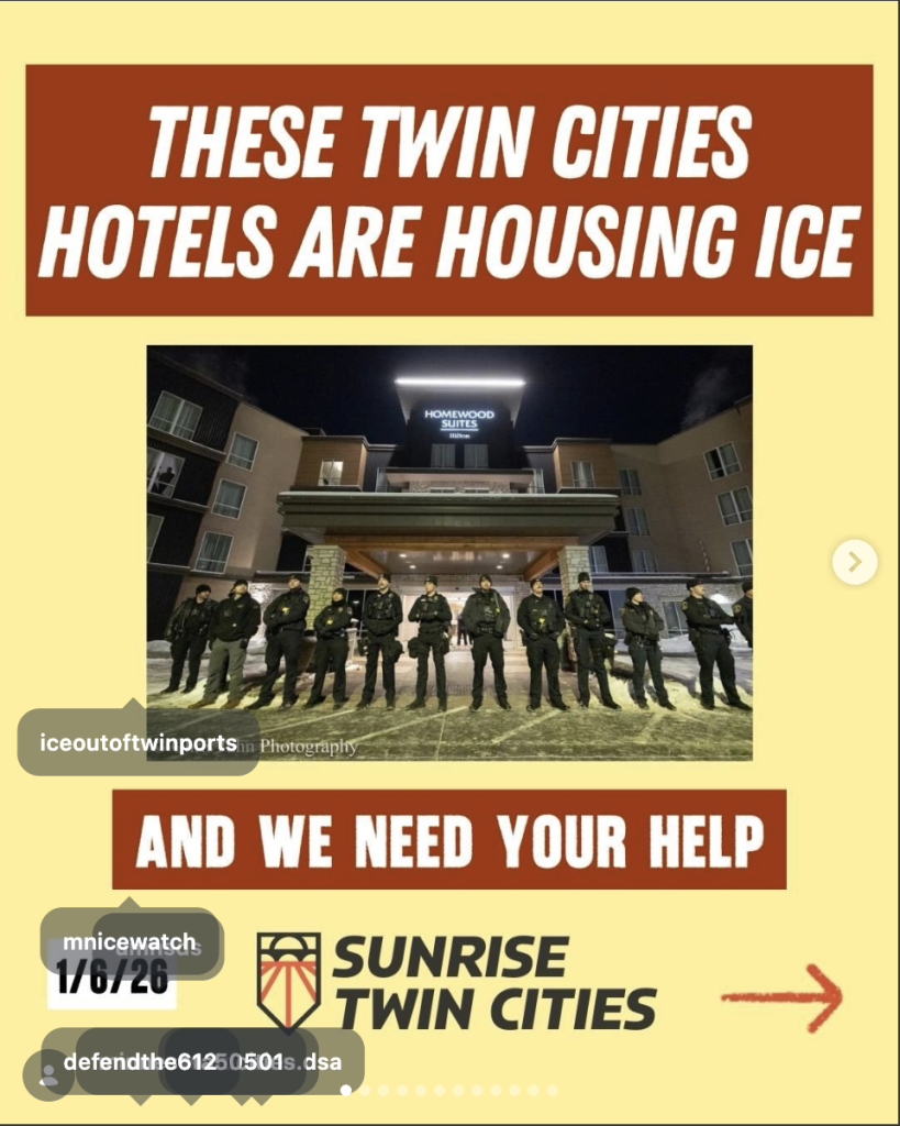 At the center of the unrest is the Sunrise Movement, a left-wing group founded to fight climate change that has since directed its local chapters to fight the Trump administration. For Sunrise Twin Cities, that means tormenting ICE agents on the ground. The group holds in-person “action trainings” on how to “stop ICE & build a revolution.” It also maintains a running list of the Twin Cities hotels housing ICE agents and organizes late-night “noise demonstrations” aimed at making it “impossible” for those hotels to operate.