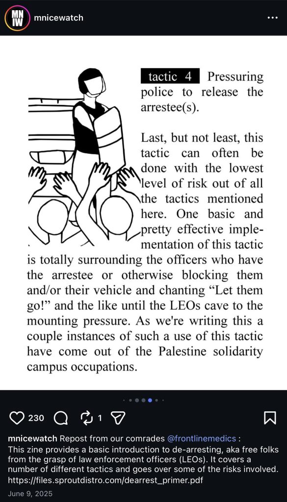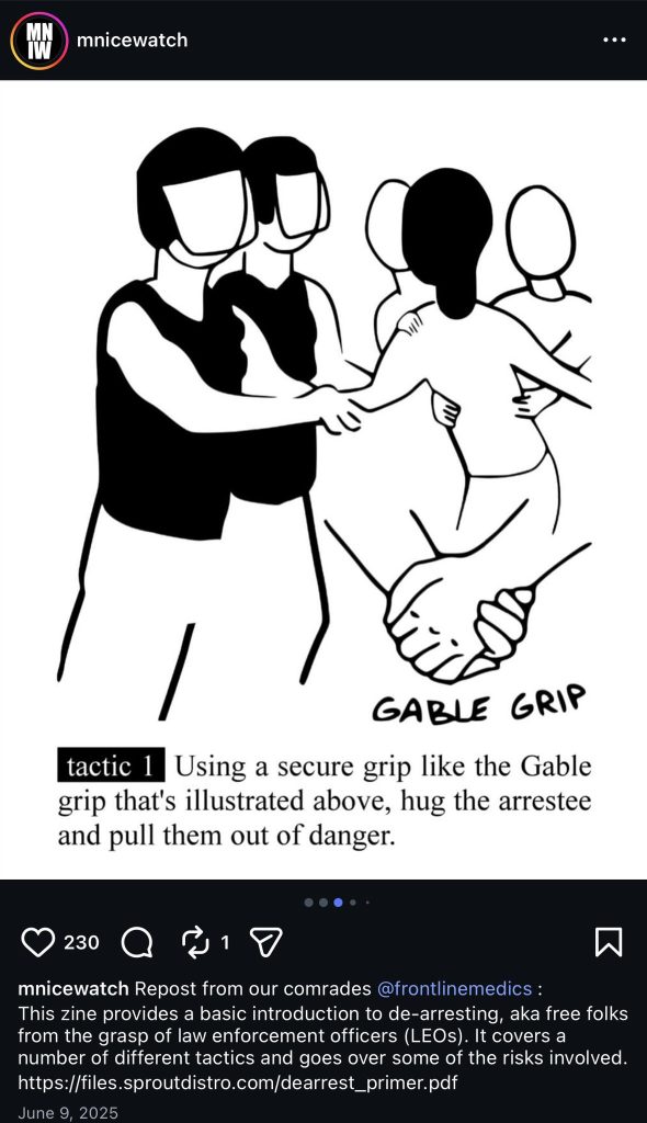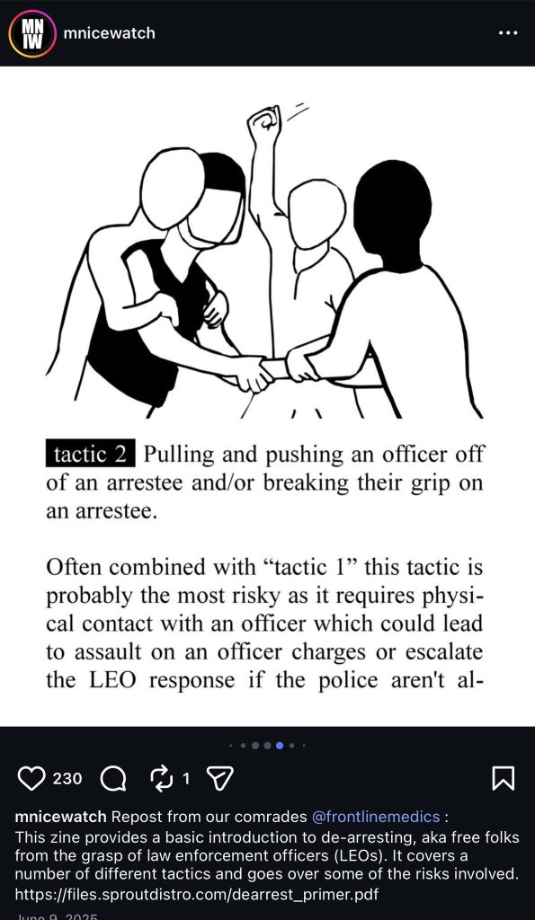 Last June, the page posted training slides that it described as a “basic introduction to de-arresting,” a tactic in which activists pressure police to release arrestees. One slide calls for “totally surrounding the officers who have the arrestee or otherwise blocking them and/or their vehicle and chanting ‘Let them go!’ and the like until the LEOs [law enforcement officers] cave to the mounting pressure.” A second slide calls for “pulling and pushing an officer off of an arrestee and/or breaking their grip on an arrestee,” a move the slide says is “probably the most risky as it requires physical contact with an officer.”