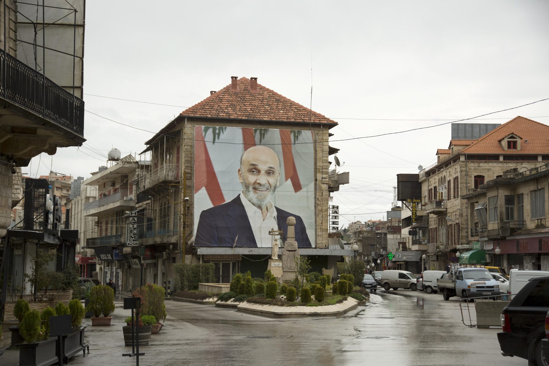 A poster of Samir Geagea, leader of the Lebanese Forces political party, in the center of Zahlé. During the civil war, the party was heavily involved in Lebanon’s sectarian battles. (Jacob Russell)