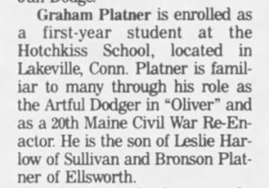 “Graham Platner is enrolled as a first-year student at the Hotchkiss School, located in Lakeville, Conn.,” a Maine newspaper, the Ellsworth American, reported in November 1999. “Platner is familiar to many through his role as the Artful Dodger in ‘Oliver’ and as a 20th Maine Civil War Re-Enactor.” The Hotchkiss School is located roughly 60 miles from Yale University in northwestern Connecticut.