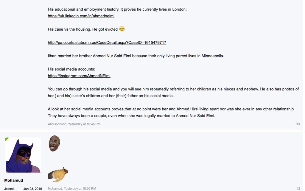 Citing the SomaliSpot post and online marriage information, I contacted Omar’s campaign and got a response from criminal defense attorney Jean Brandl. I had seen her in court representing one of the six Somali defendants who pleaded guilty in the 2016 ISIS terrorism case. The attorney’s message was a classic nonresponse response that called me a bigot and said I should direct further questions to her rather than the campaign spokesman I had called. She seemed to think she could scare me off. When I directed my further questions to her as she had instructed, she ignored me.