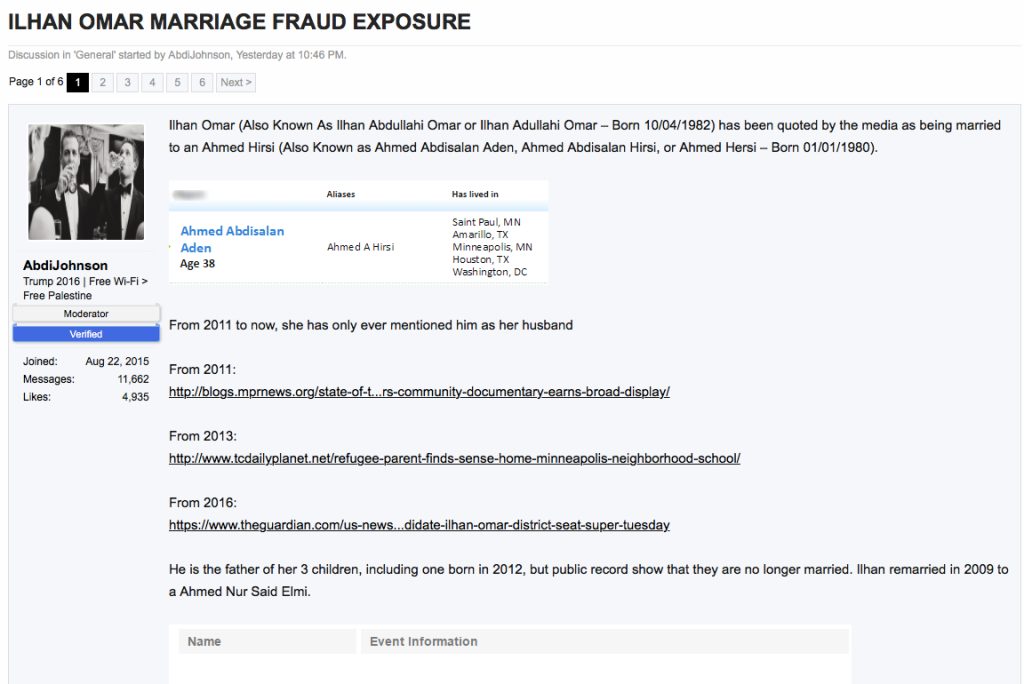 I checked out the SomaliSpot story online through the Minnesota Official Marriage System. Inputting Omar’s name, I found that the two marriages cited in the SomaliSpot post checked out as indicated. The site reflected Omar’s 2002 marriage to her advertised husband, Ahmed Aden (later Ahmed Hirsi), and her 2009 marriage to Ahmed Nur Said Elmi, identified in the SomaliSpot post as Omar’s brother. As it turned out, Omar and Hirsi had only applied for a marriage license in 2002 but never followed through with a legal marriage.