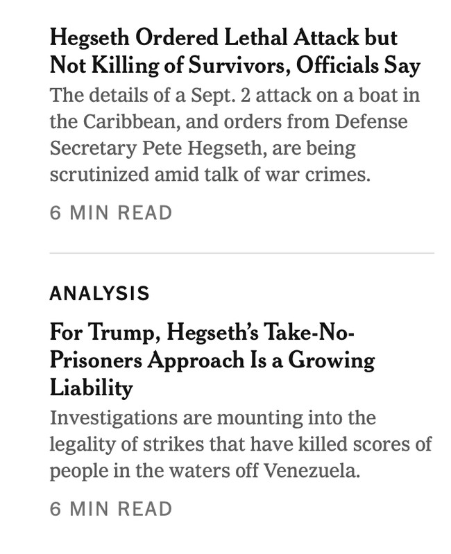 Meanwhile, over at the Wall Street Journal, they’re still writing headlines giving Hegseth the presumption of guilt. Monday night’s late-breaking headline reads: “White House Defends Hegseth Over Strike on Alleged Drug Boat That Killed Survivors.”